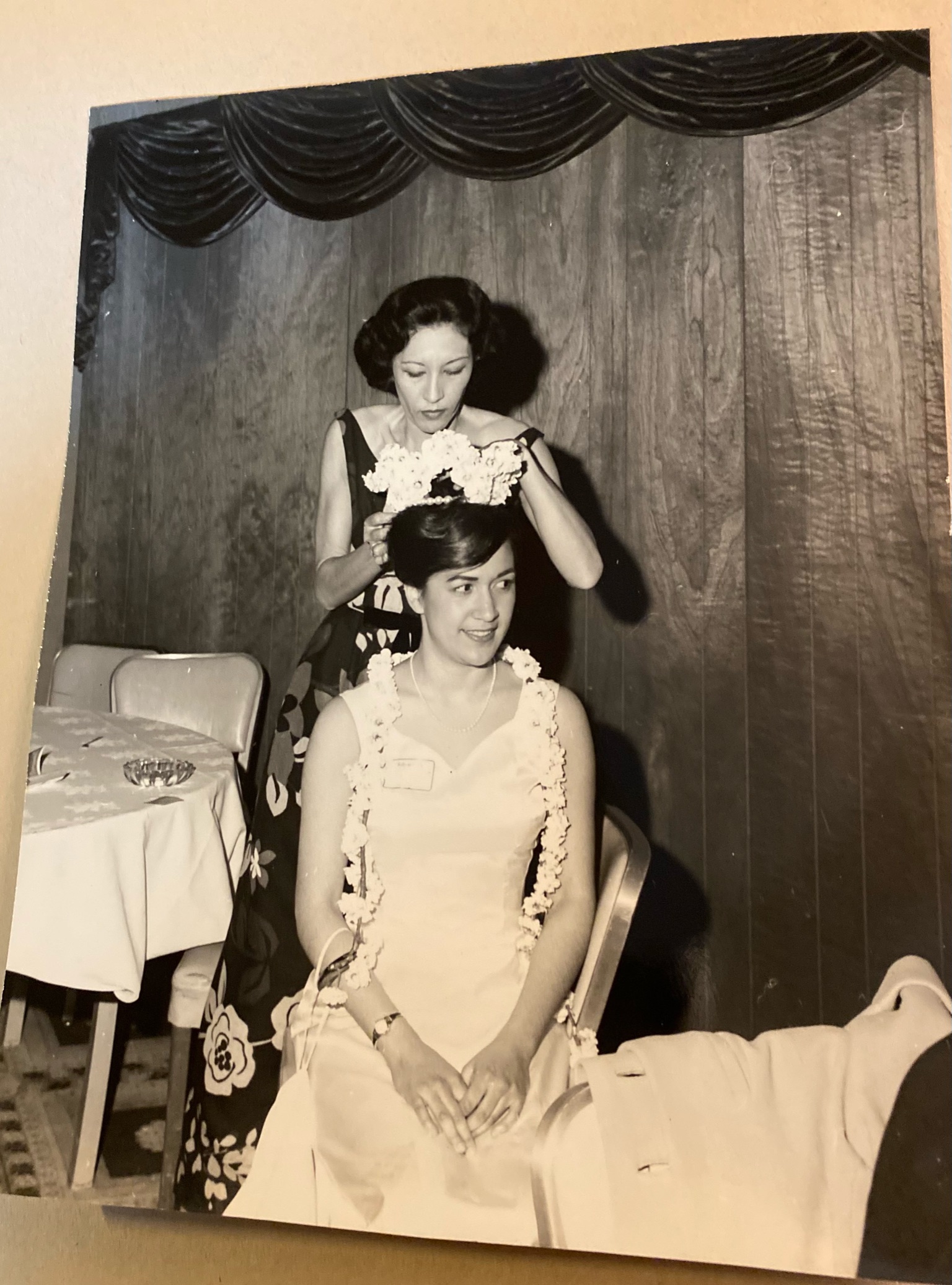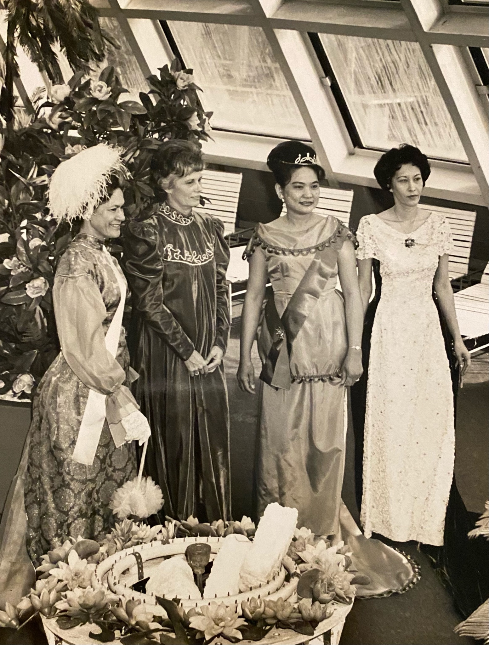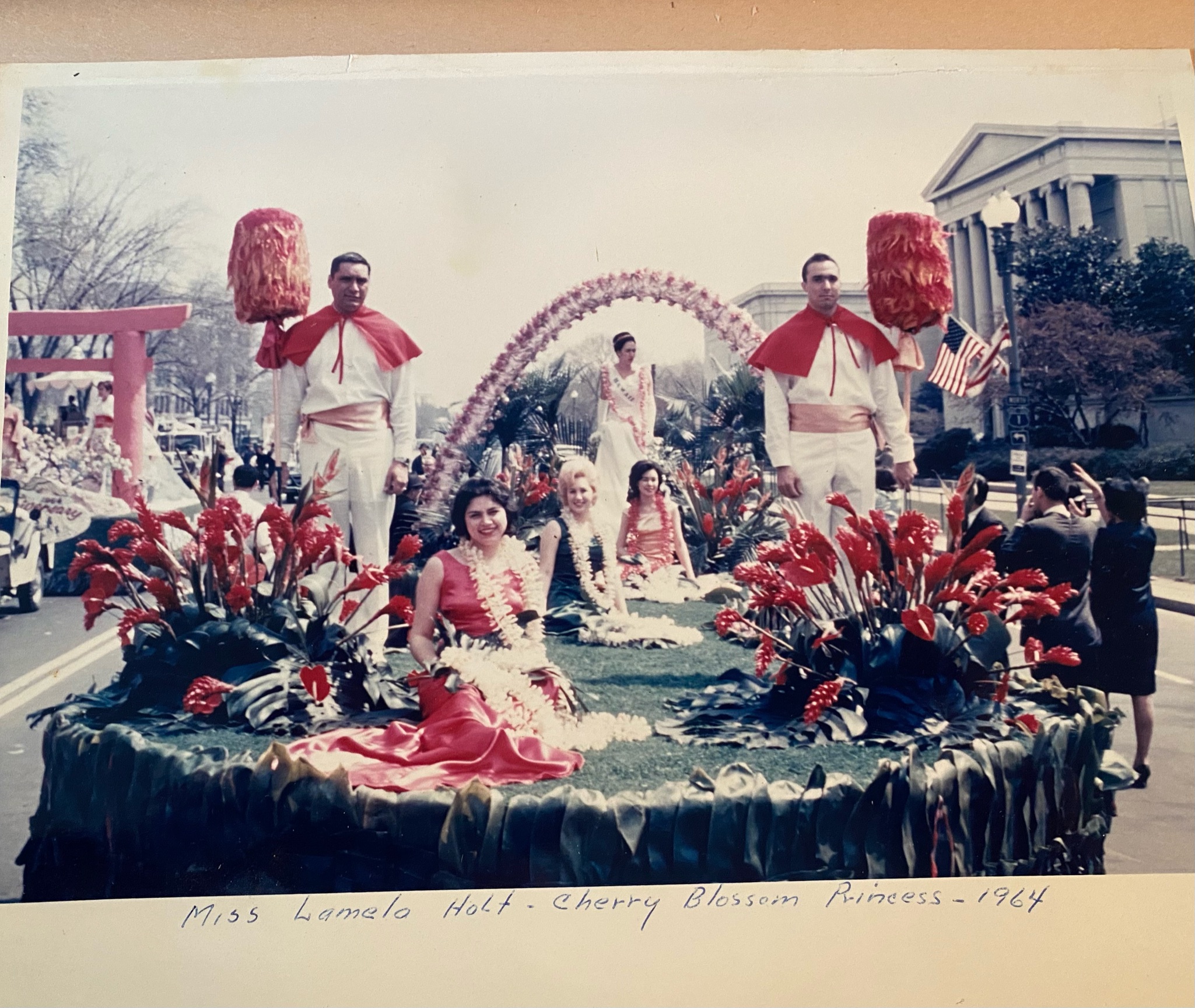 Images above clockwise, fixing the flower crown for the 1964 Cherry Blossom Princess Lamela Holt; Hawaii’s float for the Cherry Blossom Parade – Lani helped to design and build; Performing hula noho – seated hula. That’s me trying to ‘ami no doubt. Pagent depicting the queens of Hawaii for the Princess Kaiulani Ball, Washington, DC.